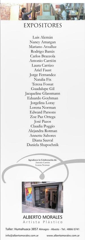 ![]() Un acto heroico Despues de todo un año de trabajo, hacemos esta muestra de todos los alumnos que participaron del taller. Esta exposición es para cada uno de nosotros y para, de alguna manera, saber en qué andamos, qué vemos y qué entendemos del mundo que nos rodea, y encontrar la forma de contarlo, pero también mostrar y demostrarnos qué es lo que nos gusta hacer, cómo lo disfrutamos y valoramos Una exposición no es un acto de vanidad, es un acto heroico de afirmación, una exposición es para hacer un resumen de la tarea realizada, es para decir "es esto" y no otra cosa. Es lo que te representa y te enseña, porque al ver tu trabajo a la distancia, terminado y colgado en un ámbito distinto, permite descubrirte, reconocerte y valorar tu trabajo, y que sepas, y que sepan, de la importancia que tiene esto para vos, también es parte del aprendizaje, y de cerrar una etapa, para encarar una nueva. Pero esta propuesta de exposición de alumnos del taller es también para encontrarnos, abrazarnos, brindar por todo lo que hemos recibido y dado a cada uno de nosotros, mostrarnos y demostrarnos la alegría de apostar a lo que viene, de la alegría de la creación, que aunque no te des cuenta estás creando, está bien, es lo primero, el principio, pero creando. Alberto